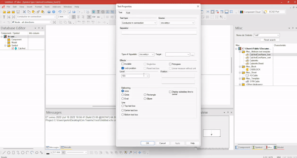 Para cambiar el tipo de texto de un símbolo, abra el Editor de base de datos y edite el Símbolo que prefiera. Haga doble clic con el botón izquierdo del mouse en el texto que desea modificar para abrir la ventana Propiedades de Texto.